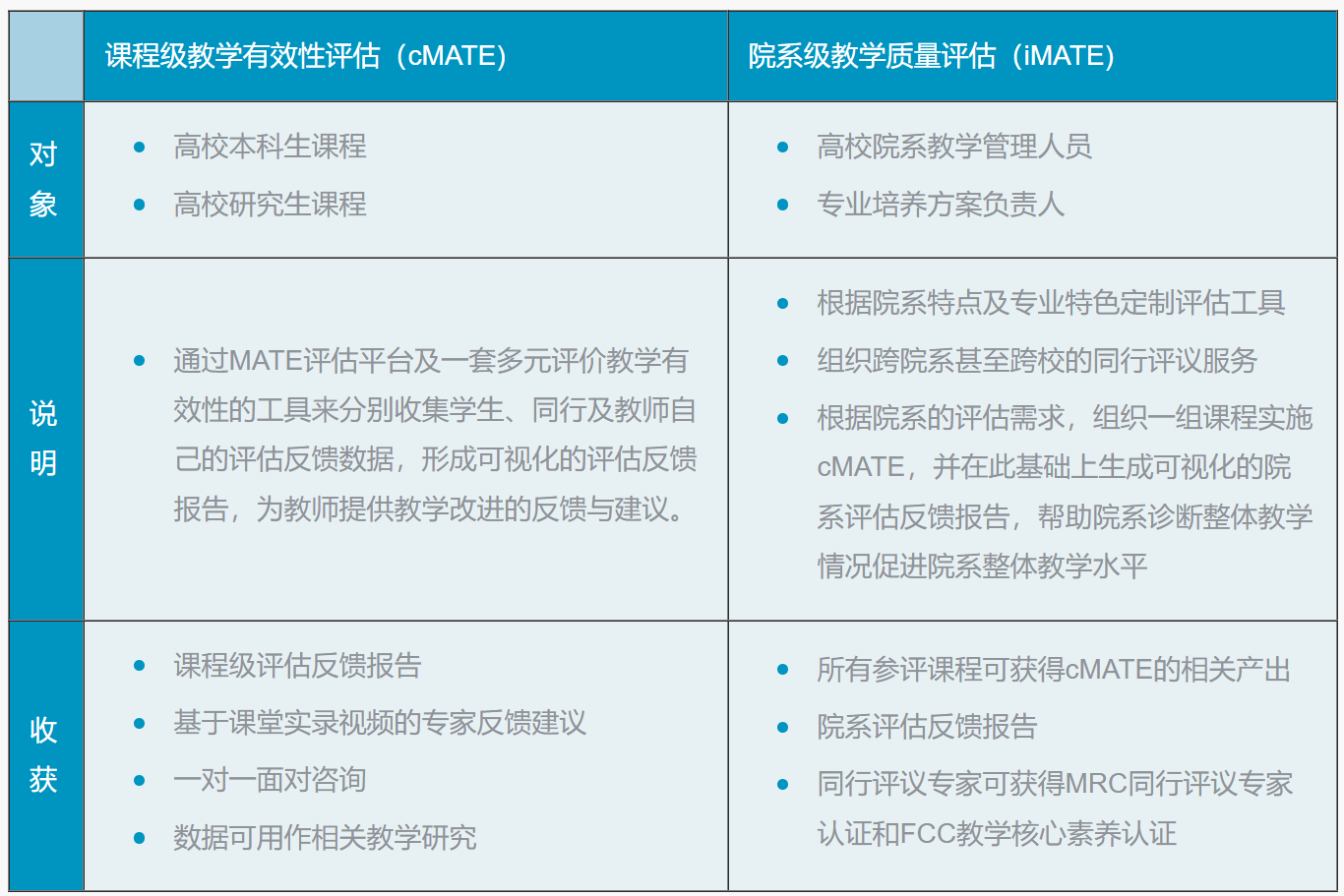 MATE评估方案共分成课程级和院系(培养方案)级2种。课程级评估旨在帮助一线教师像照镜子一样更加全面立体地了解自己的教学状况,并以评估结果为抓手,为参加评估的教师提供教学改进的反馈与建议,为教学发展提供支撑和引导。院系级评估旨在帮助高校院系诊断一组课程整体的教学有效性状况,并基于综合评估结果提出相应的改善计划和优化策略,进而全面促进院系的整体教学水平,打造一流学科品牌。
