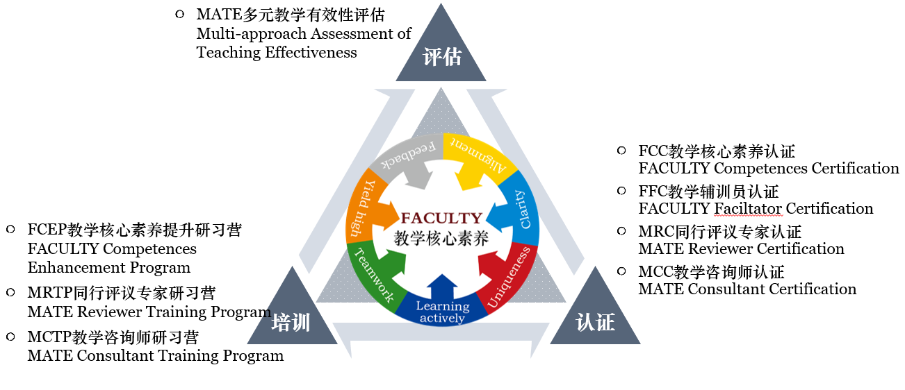 提升教学能力路径方面,课程构建了“评价-培训-认证”体系。依托“FACULTY”教师教学核心素养、专门设计的教师教学核心素养认证体系和实践社区等环节,将教师教学能力提升,教师资质认证和教师课程教学有效性评估有机融合,围绕“FACULTY”教师教学核心素养形成一个完整的教师教学能力发展体系。
